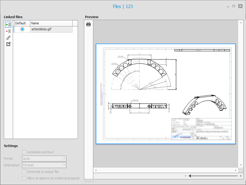 in the window opens the linked file in the program which the file type is associated with in Windows. If you link a file to records such as quotes, orders, operations, and material, you can activate Automatic printout. This means the linked file will automatically become printed together with the main document.