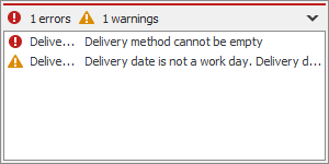 For example, if a delivery method is missing on a customer order the validation will show an error symbol next to the field. If the delivery date on a customer order row is not a work day or is not one of the customer's recommended delivery days, then the validation will show a warning symbol