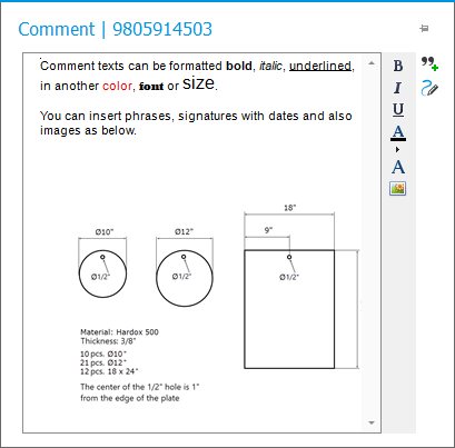 In registration and reporting procedures you can enter different types of comments, instructions, additional texts, etc. for loaded records. Then you will find a small text editor containing functions for text formatting. Besides writing text, you can also insert images, phrases (from a phrase register), and your signature (consisting of today’s date and your user name). You can also unpin the text editor window by using the button in the top right corner.