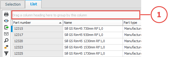 At the top of all lists there is an interactive grouping header (1). To group the list you drag a column heading from the list using your mouse pointer, and drop it on the grouping header. You can group in several levels by dragging multiple column headings to the grouping header. Conversely you can also remove a grouping by dragging a column heading from the grouping header and drop it between two other column headings in the list. Then that column will be moved back to the list.