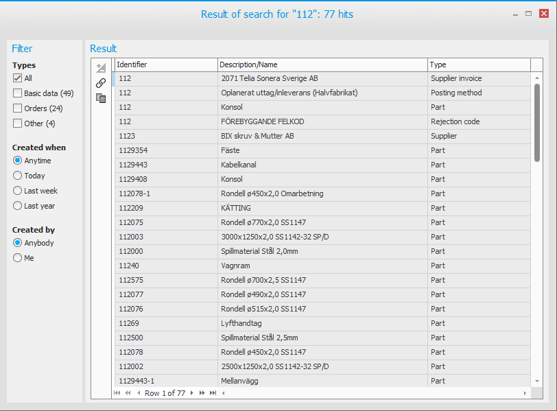 When you have performed a search, rows containing all matches will be shown in a result window (see below). Up to 1,000 rows of matches can be shown. In the result window you have the opportunity to filter records by all data, basic data, order, supplier invoice, case, and/or voucher. You can also filter by when the records were created; anytime, today, last week, or last year. You can also filter by who created the records: anybody or you.