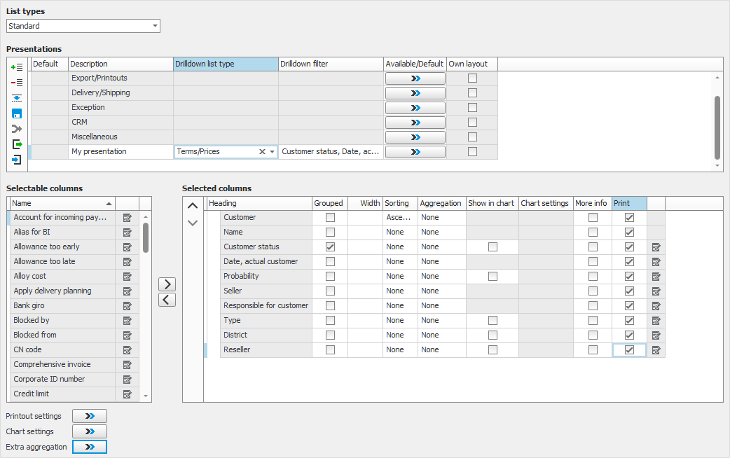 Under the column tables you can also configure Printout settings, Chart settings, and settings for Extra aggregation. Note that the Print setting determines if the column is included upon Export to Excel (raw data).