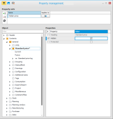 The administrator accesses this function by using the button Property management on the toolbar in each single-record procedure and table procedure. When using the button, a property window opens where the administrator adds one or several Property sets and there select which users, groups, or roles each property set Applies to.