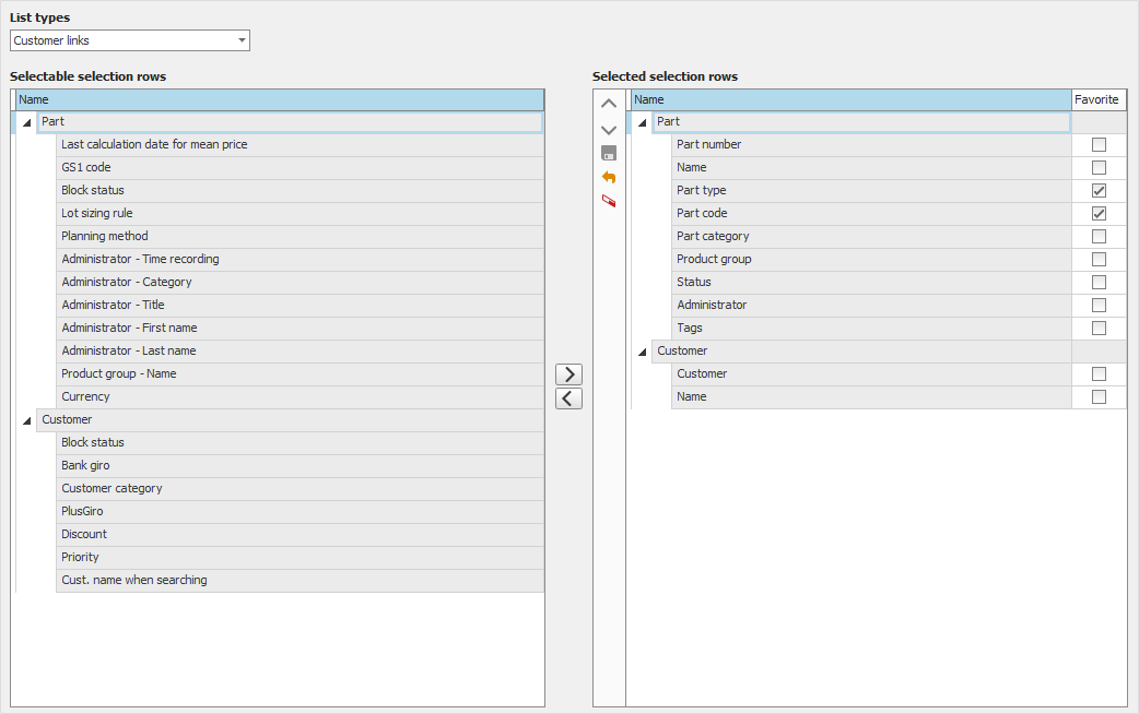 In the table containing selected selection rows you can also check the checkbox Favorite for the rows which you most often use when you select data in the procedure. Rows you have marked as favorites are then shown at the top of the Selection tab in a separate section called Favorites.