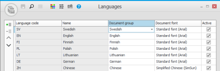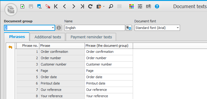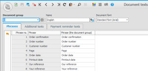 In the Document texts procedure it is also possible to translate phrases. These phrases exists in document group which you register in the procedure and then connect to a language in the Languages procedure. The phrases are the headings (lead texts) which occur on all printed documents. When you install the system, document groups with finished phrase translations are included for the languages you find under Language in backstage in Monitor ERP.