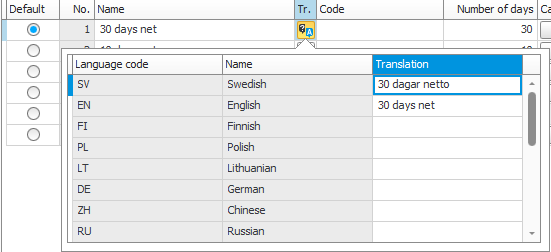 In many registers in Monitor ERP you can translate data to the different languages registered and set as active in the Languages procedure. What can be translated are texts for names, descriptions, explanations, etc. for different records. For these fields there is a translation table linked under the Translations button . In the image below you see the button next to the Name field for payment terms in the Terms procedure.
