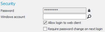 Settings which need to be configured by the administrator under the Security tab in the Users procedure in the Windows client.