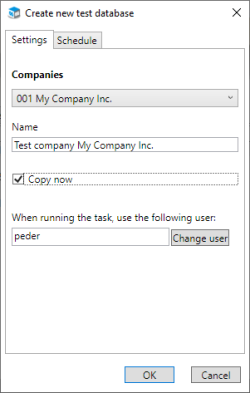 - Decide if the alternative Copy now should be selected (default). This will copy the company database to the test database directly when it is created. This can also be done using the Copy new test database button