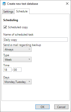 - If you wish to create a scheduled copying task for the test database, select the Schedule tab and move on to point 6, below.