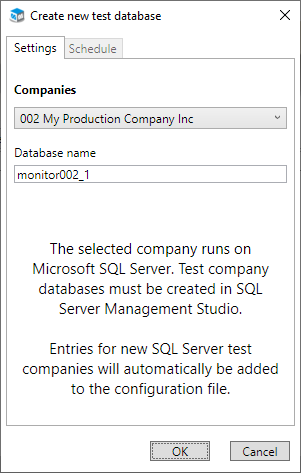 - If you want to add a scheduled copying task to a test database on SQL Server, use the script TestCompanyCopy.sql and create a scheduled run of the copying task in Microsoft SQL Server Management Studio. You should have received the script from Monitor ERP System AB.