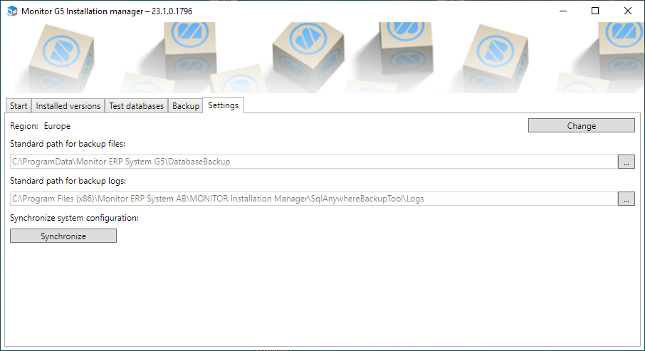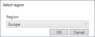 The first time you start the installation manager a dialog is shown where you should select the region where your Monitor ERP Server is installed. You can choose between Europe and China. There are distribution servers for these regions. The China option regarding region should be selected in order to improve the performance during updates if the server is located in China. The Europe region should be selected for Europe and the rest of the world. It is possible to change region afterwards in the installation manager. This should then be done under the Settings tab.
