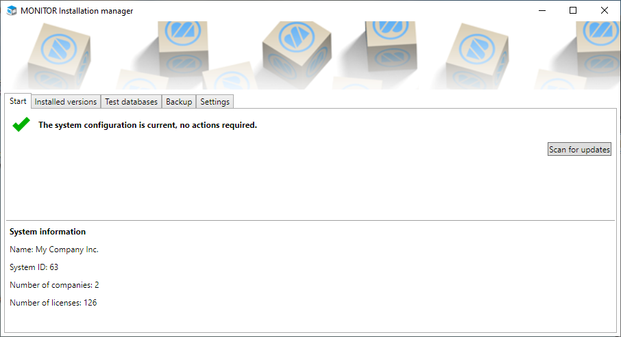 Under the Start tab, a check is made to see if there are any updates available for the system. This takes place automatically when you have started the installation manager but you can also start the check manually by using the Scan for updates button. Such updates can be, for example, additional licenses or a new company which have been delivered to your system by Monitor ERP System AB. A new company must be activated here.