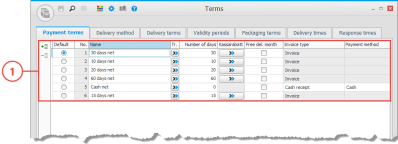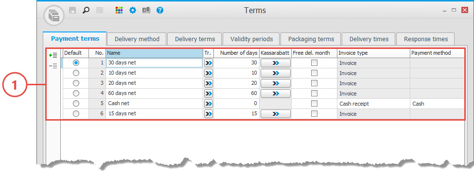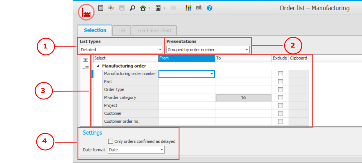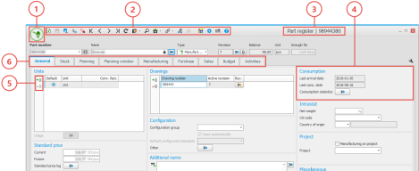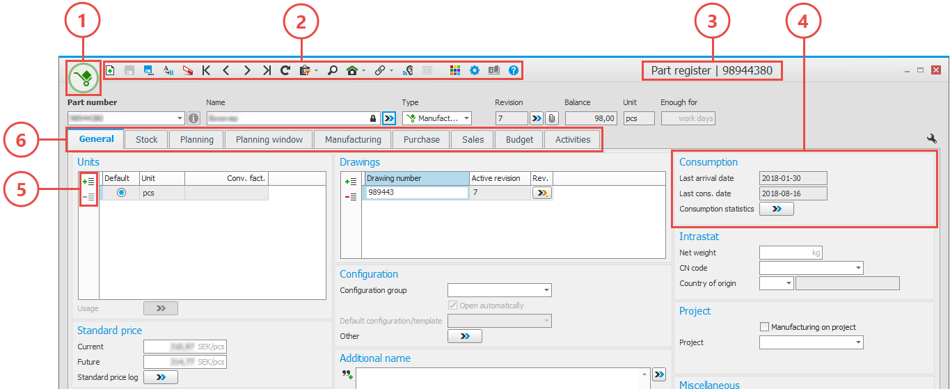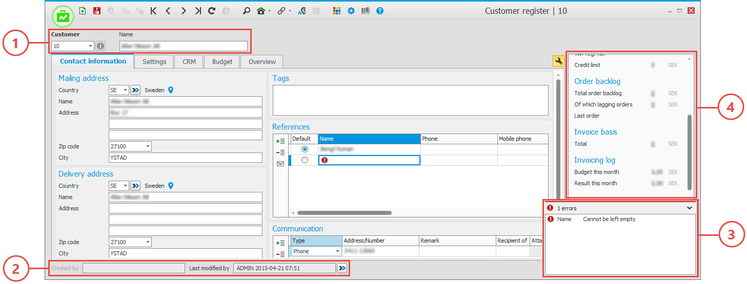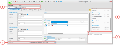 Single-record procedures are used to register and update one data record at a time. These are data records which contain a lot of information, for example parts, customers, and customer orders. The procedure windows also contains the following sections: Header row (1) with record selector, Status row (2) with information about when the record was most recently modified and printed, Validation window (3) showing warnings and errors, if any, from different validations in the procedure, and the Side panel (4) containing useful information from different registers linked to the data record in question.