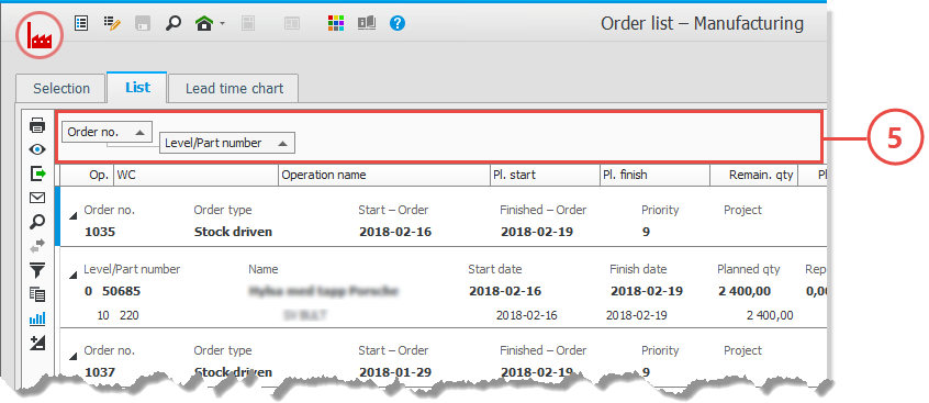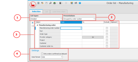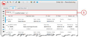 List procedures are used to select and load several data records to different list for printing and reporting. The procedure windows contain the following sections: List types (1), Presentations (2), Selection rows (3), Settings (4). A list is shown in the List tab, which has a Grouping header (5). Some of the lists also have a side panel.