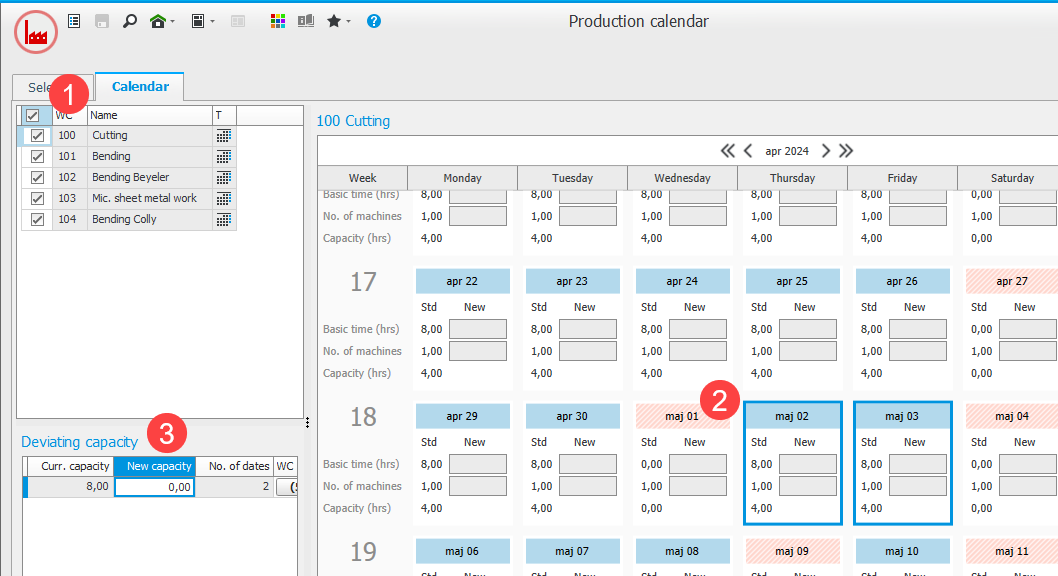 That depends on how you have set up the system, but a rule of thumb is to do it in the production calender. Mark the production groups that you would like to close, then mark the days, and finally, enter the new capacity.