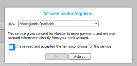 For most banks you are required to have also onboarded with them prior to activating the integration.If you use Swedbank or Sparebank1, you will then need to select the relevant local bank.
