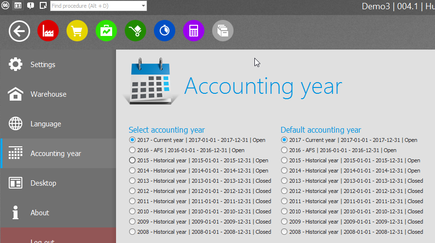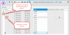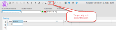 You can also temporarily shift accounting year in certain procedures by clicking the button Change accounting year on the toolbar of the procedure.