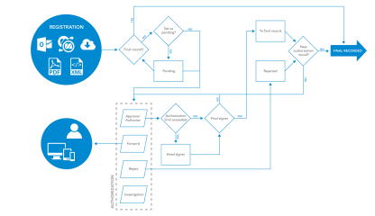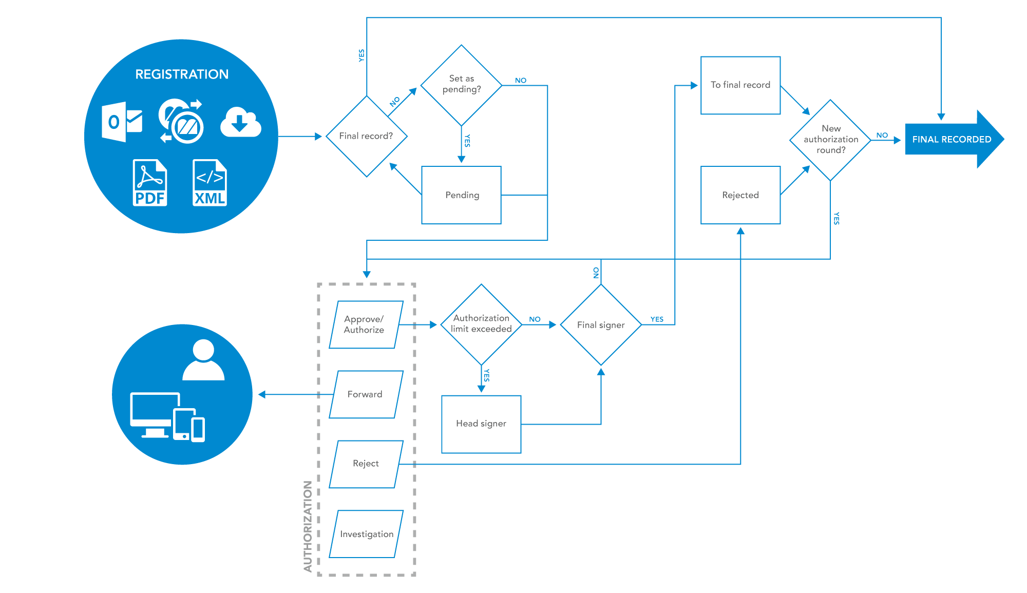 - E-invoices which are automatically imported, registered, and sent for authorization.