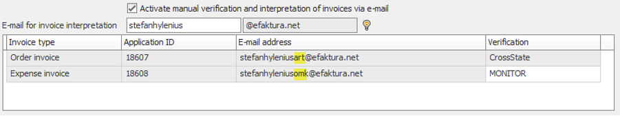 Leave the e-mail field using Tab when you have entered the address. Two e-mail addresses will then be created for separate invoice types and application ID. This is done to be able to handle both expense invoices and material invoices (order invoices).