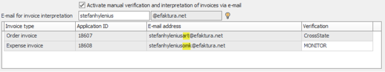 Please note! The addresses will automatically be updated with art and omk before @ in the address (see the yellow highlight in the image below). The image in the example is from a test account. In test accounts @efaktura.net is used instead of @crossstate.se which is used by the production account (the live account).