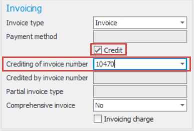 For a new invoice you mark the Credit checkbox and in the field Crediting of invoice number (which will then become available) you select the debit invoice to credit. When you have selected an invoice number a dialog box appears.