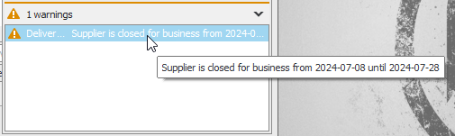 Check when your suppliers are on vacation and enter those dates as a Calendar exception in the Supplier register. You will then receive a warning message if you register a purchase order to suppliers while they are on vacation. The warning messages are shown in the Purchase order suggestions and Stock refill – Purchase procedures.